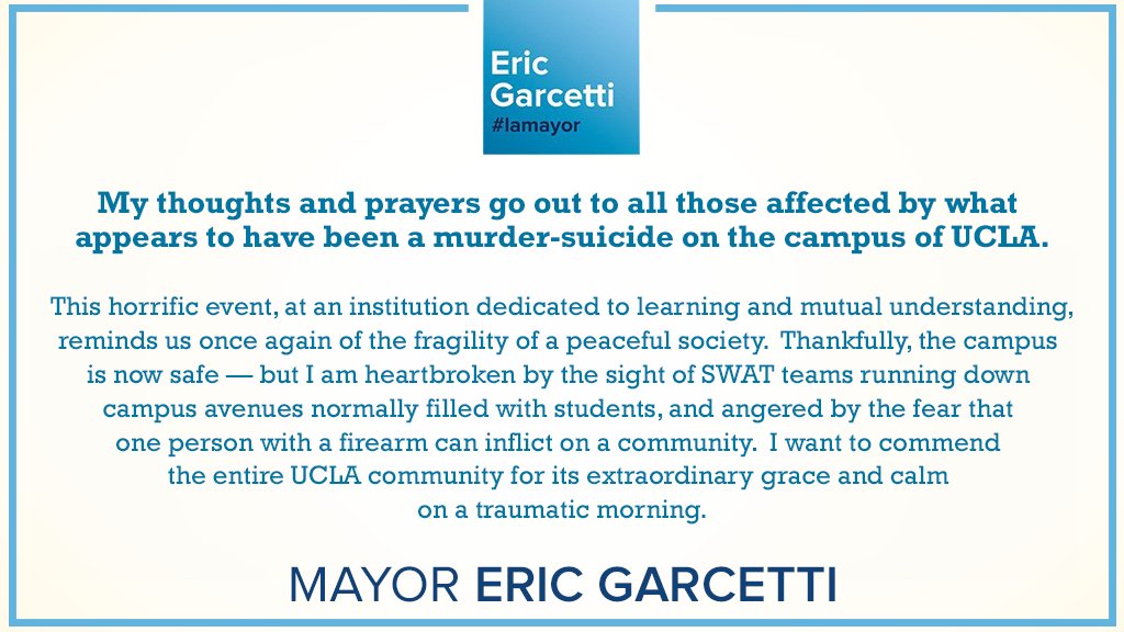 LA ျမို႔ေတာ္၀န္ကလည္း သူ႔၏ twitter အေကာင့္မွေန၍ ၀မ္းနည္းေၾကာင္း၊ တည္ျငိမ္စြာ တုန္႔ျပန္ႏိုင္ခဲ့သျဖင့္ အားလုံးကို ဂုဏ္ယူပါေၾကာင္း၊ ထုတ္ျပန္ခဲ့သည္။ (Photo – UCLA Bruin pages)