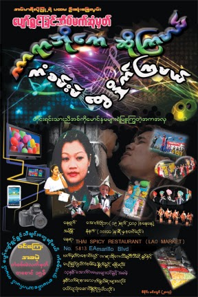 ပြဲလာသည့္ ဧည့္ပရိတ္သတ္မ်ားအတြက္ ကာရာအိုေက ေတးသီခ်င္း သီဆိုခြင့္ႏွင့္ ကံစမ္းမဲႏွိဳက္ခြင့္ လက္မွတ္တစ္ေစာင္လ်င္ ၁၅ ေဒၚလာ ႏွဳန္းထားျဖင့္ ၀ယ္ယူအားေပးကာ ဗလာမပါသည့္ ကံစမ္းမဲလက္မွတ္မ်ားကို ေပ်ာ္ရြင္စြာ ႏွဳိက္ယူကံစမ္းႏိုင္ေၾကာင္း ပြဲျဖစ္ေျမာက္ေရး စီမံခန္ ့ခြဲသူမ်ားက ဆိုသည္။