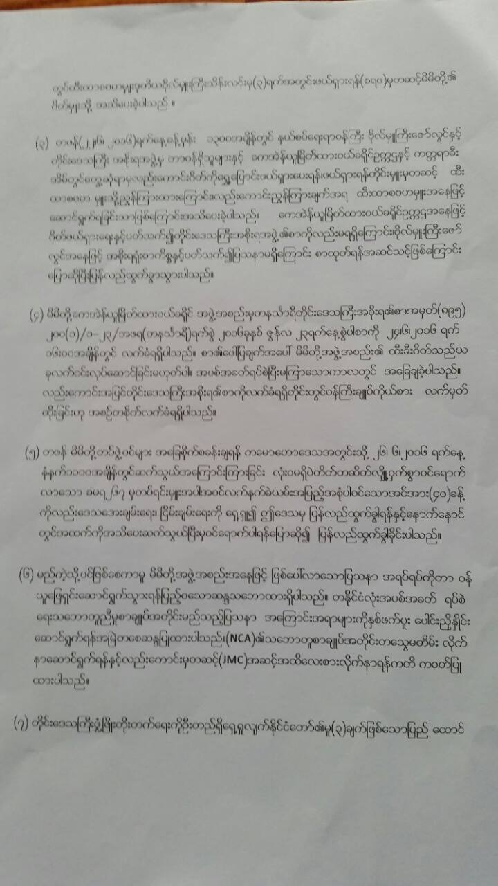 ၃၄။ နယ္လံုဝန္ၾကီးရဲ႕လုပ္ရပ္ဟာ တိုင္းေဒသၾကီးအစိုး႐ရဲ႕ ညႊန္ၾကားခ်က္ကို အသိေပးဖို႕ အတြက္ အစိုးရရဲ႕လက္နက္ကိုင္တပ္အျဖစ္ တစ္ဘက္အဖြဲ႕အစည္းက ရႈျမင္တဲ့ တပ္မေတာ္မွ ဗ်ဴဟာမွဴး အဆင့္ အရာရွိၾကီးတစ္ေယာက္ကို တာဝန္ေပးအပ္တာဟာ ျပသနာၾကီးၾကီးမားမားျဖစ္ခဲ့ေသာ္ SD ေအာက္ေနတဲ့ ထိုစာမွာ တိုင္းေဒသၾကီးအစိုးမွ ထုတ္ျပန္ျခင္းမဟုတ္ေၾကာင္း ျငင္းဆန္ျပီး တပ္မေတာ္က ဗ်ဴဟာမွဴး အေပၚမွာသာ လုံးလုံးလ်ားလ်ား အျပစ္ပုံခ်ဖို႕ ၾကိဳတင္စီမံကာကြယ္ထားတဲ့ ပံုစံျဖစ္ေနပါတယ္။ တကယ္တန္း ဝန္ၾကီးခ်ဳပ္က ျပသနာျဖစ္လို႕ ထီးခီးကို လာေရာက္ရွင္းလင္းခ်ိန္မွာ နယ္လံုဝန္ၾကီး မပါတာေတြ႕ရပါတယ္။
