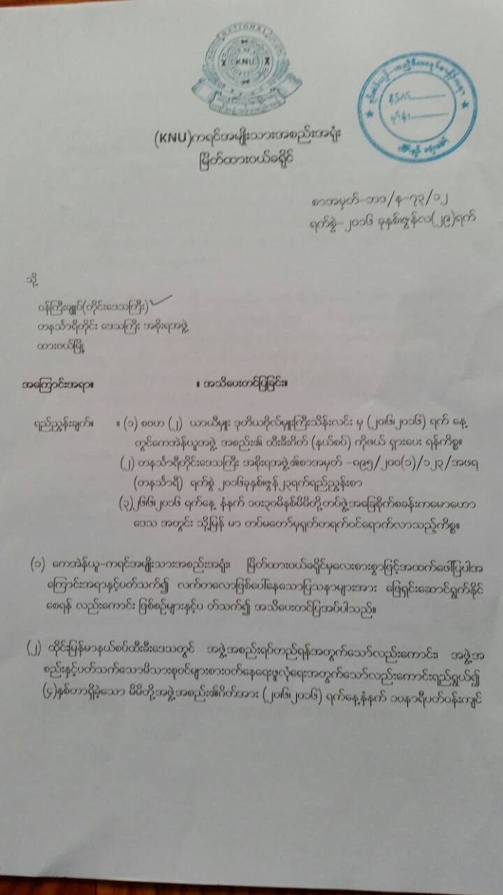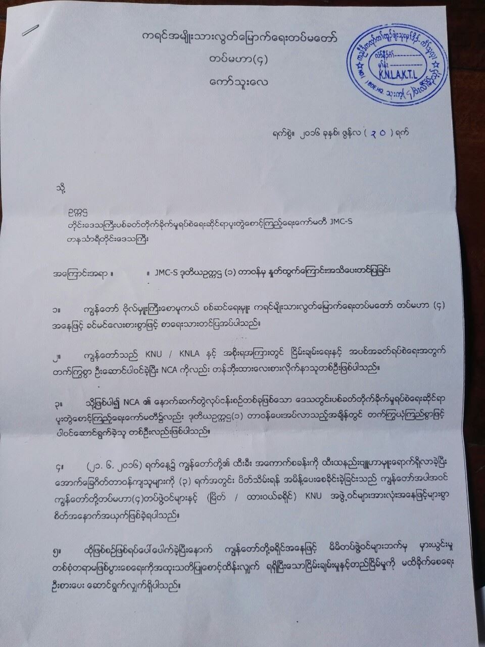 ၃၉။ အေဖက ကရင္မ်ဳိး ကရင္ေသြးအစစ္ျဖစ္တယ္လုိ႕ဆိုတဲ့ ဝန္ၾကီးခ်ဳပ္အေနနဲ႕ ဖဲဝိုင္းဒိုင္ အေကာက္ ေကာက္တာမ်ိဳး ဂိတ္ဖြင့္တာ မၾကိဳက္ႏွစ္သက္ဖူး၊ ယခင္အစိုးရထက္ ပိုလုပ္ေပးမယ္ဆိုတဲ့ စကားမ်ိဳးမေျပာသင့္ဘဲ သံတမန္စကားလံုး သိမ္ေမြ႕စြာေျပာသင့္ပါတယ္။ ရွမ္္းျပည္နယ္ေျမာက္ပိုင္း ျပည္ေထာင္စု ကားလမ္းမၾကီးမွာ အေကာက္ေကာက္တဲ့ တေအာင္းပေလာင္အဖြဲ႕နဲ႕ တန္းတူထားေနဟန္တူပါတယ္။ သူတို႕ဆီက တိုင္းေဒသၾကီးအစိုးရသို႕ ေပးတဲ့ စာဟာအဆင့္ရွိရွိ အေရးအသားျမင့္မားေနတာ သတိျပဳသင့္ျပီး မိမိရံုးက စာကေတာ့ နိမ္ေနတာ ရွက္ဖို႕ေကာင္းပါတယ္။ အစိုးရရဲ႕ျငိမ္းခ်မ္းေရးကမ္းလွမ္းမႈကို ယံုၾကည္မွူေပးဆပ္ခဲ့တဲ့ တိုင္းရင္းသားအဖြဲ႕ၾကီးျဖစ္တဲ့အျပင္ KNU ထဲမွာပင္ အေစာဆံုးလက္ကမ္းဝင္လာတဲ့ တပ္မဟာ(၄) ျဖစ္တာမို႕သမိုင္းေၾကာင္းကို ဝန္ၾကီးခ်ဳပ္နဲ႕တိုင္းမွဴးတို႕ ေလ့လာမွူအားနည္းကာ သတိထားကိုင္တြယ္ဖို႕ လိုအပ္သြားပါတယ္။ ဒီျဖစ္စဥ္မွာ အဓိကတာဝန္ရွိသူကေတာ့ နယ္လံုဝန္ၾကီး၊ ဒုတိယတာဝန္ရွိသူက တိုင္းမွဴး၊ တတိယ တာဝန္ရွိသူက ဝန္ၾကီးခ်ဳပ္၊ ထိုးေၾကြးခံရျပီး မီးစေမႊးတဲ့ စစ္ဗ်ဳဟာမွဳးတို႕ျဖစ္ပါတယ္။ ဇာတ္လမ္းအက်ိဳးဆက္က လုပ္ထံုးလုပ္နည္းမွားယြင္းတဲ့ ရံုးစာညႊန္ၾကားခ်က္၊NCA စာခ်ဳပ္ပစ္ပယ္ထားမွူေၾကာင့္ ယံုၾကည္မွူေတြေပ်ာက္ဆံုးသြားတဲ့ KNLA တပ္မွဴးၾကီးႏႈတ္ထြက္လိုက္ရာ မိမိတို႕ျငိမ္းခ်မ္းေရးေရာင္ျခည္အေပၚ တိမ္တိုက္ဖံုးလႊမ္းသလို ျဖစ္သြားျပီး လိုက္လံဖါေထးရတဲ့ အရွက္ဂုဏ္သိကၡာ ေပးဆပ္လိုက္မႈ၊ ဖိအားေပးလိုက္တဲ့ ဂိတ္ဖယ္ရွားေရး ညႊန္ၾကားခ်က္ စကၠဴစုတ္သဖြယ္ ေရထဲေမ်ာသြားပါတယ္။
