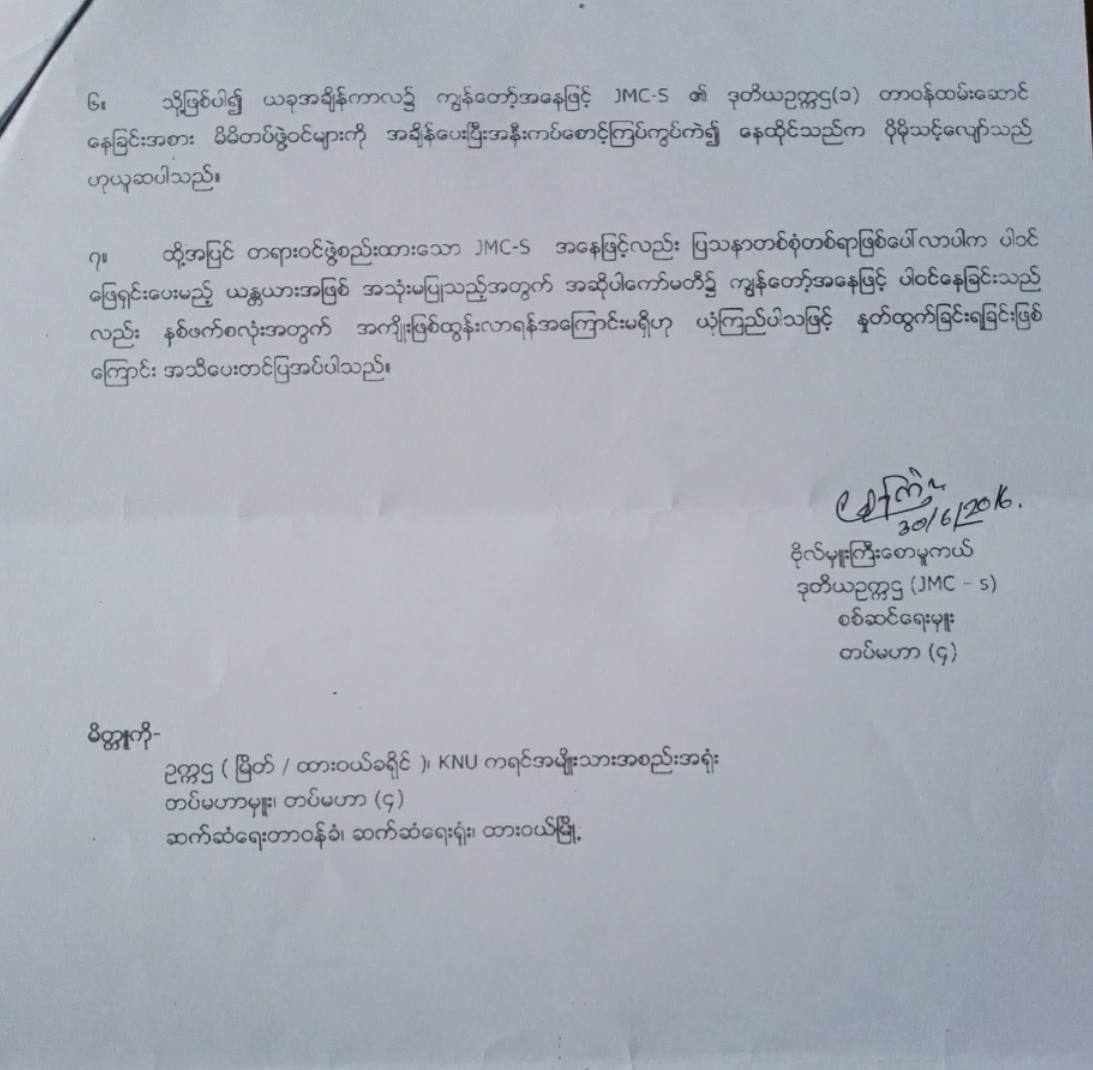 ၃၁။ KNLA ဗိုလ္မွဴးၾကီးေစာမူကယ္က စိတ္ပ်က္သြားတာက JMC-S က ဒီလိုျဖစ္စဥ္မွာ ဝင္ျပီးကိုင္တြယ္ေပးသင့္တယ္လိုု႔ သူထင္ေၾကာင္း၊ အမိန္႕နဲ႔ (၃)ရက္အတြင္းေျပာင္းခိုင္းတာဟာ အထက္စီးဆန္ ျပင္းထန္လြန္းတယ္လို႕ ေဘးကပင္ ၾကည့္ၾကည့္ ေပၚလြင္ေနေၾကာင္း၊ ပိုဆိုးတာက သူေနတဲ့ ေဒသကို တပ္က သြားဝိုင္းလို႕ယံုၾကည္မႈ ေလ်ွာ့ပါးေစေၾကာင္း၊ သ႕ူထြက္စာကို တိုင္းမွဴးက JMC-S အစည္းအေဝးလည္းလုပ္တဲအခါ ခြင့္ဆိုျပီး အသာေခါက္ထားျပီး ၾကိတ္ညွိမယ္ဆိုတာမ်ိဳး ရွိဟန္တူတယ္လို႔ ယံုၾကည္ေလာက္တဲ့သတင္းအရင္းအျမစ္မွသိရတယ္။