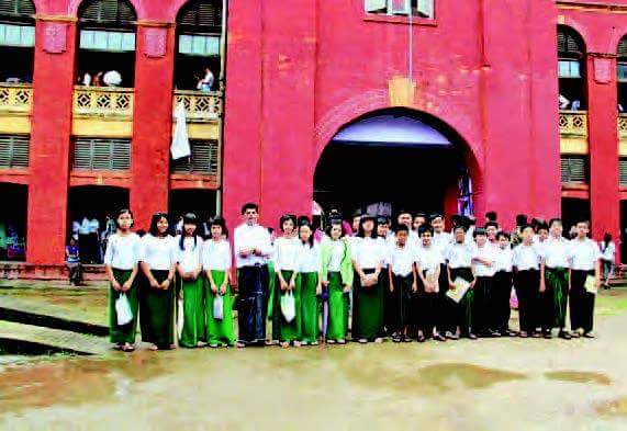 ဝယ္လာသည့္စာအုပ္မ်ား ကိုယ္စီေပြ႕ပိုက္ကာ ထိုအေဆာက္အအုံ ေနာက္ခံႏွင့္ အမွတ္တရ ဓာတ္ပုံ႐ိုက္ယူေနေသာ ေက်ာင္းသားငယ္မ်ားကို ေငးလ်က္…။