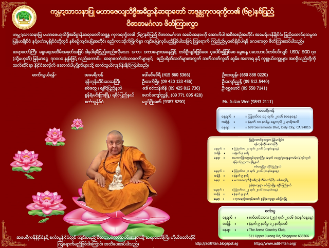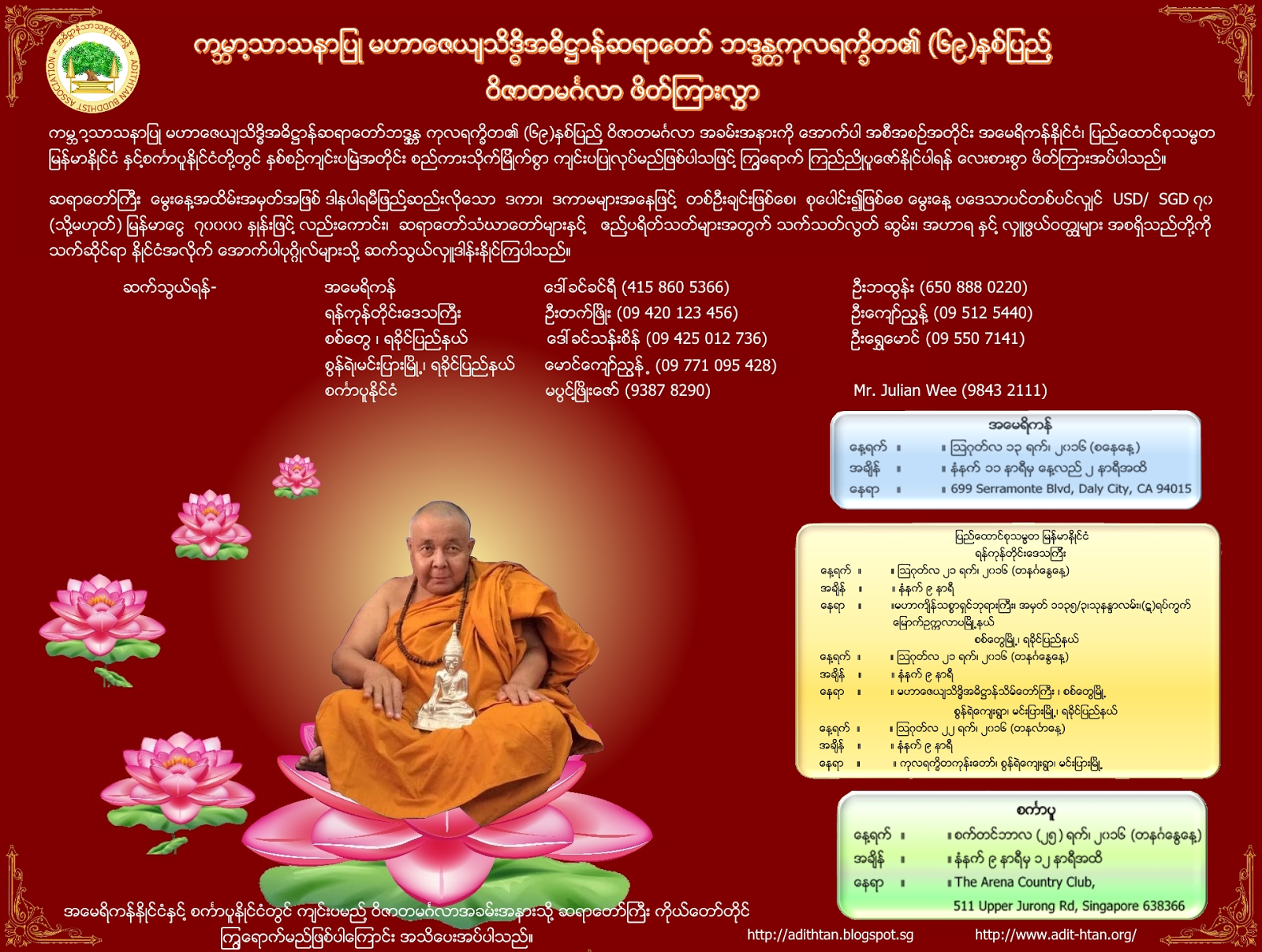 ကမ ၻာ႔သာသနာျပဳ မဟာေဇယ်သိဒိၶၶအဓိ႒ာန္ဆရာေတာ္ဘဒၵႏၻ ကုလရကၡိတ၏ (၆၉)ႏွစ္ျပည္႔ ဝိဇာတမဂၤလာ အခမ္းအနားကို အေမရိကန္နိဳင္ငံ၊ ျမန္မာနိဳင္ငံ ႏွင္႔ စကၤာပူနိဳင္ငံတို႔တြင္ ႏွစ္စဥ္က်င္းပၿမဲအတိုင္း စည္ကားသိုက္ျမိဳက္စြာ က်င္းပျပဳလုပ္မည္ျဖစ္ပါသျဖင္႔ ၾကြေရာက္ ၾကည္ညိဳပူေဇာ္နိဳင္ပါရန္ ေလးစားစြာ ဖိတ္ၾကားအပ္ပါသည္။