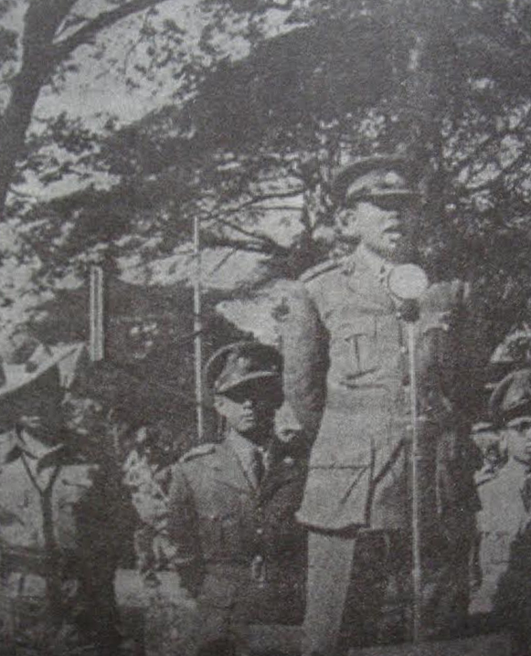 | ၁၉၄၉ ဇန္န၀ါရီလ ၄ ရက္ေန႔ (၁) ႏွစ္ျပည့္လြတ္လပ္ေရးေန႔ ေမၿမိဳ႕စစ္ေရးေလ့က်င့္ကြင္းမွာ ေျမာက္ပုိင္းတုိင္းမွဴးအျဖစ္ မိန္းခြန္းေျပာေနသည့္ ေဖေဖ။ (အေနာက္က ေဂၚလခါးဦးထုပ္ႏွင့္သူမွာ ဗုိလ္မွဴးႀကီး လွေမာ္) |