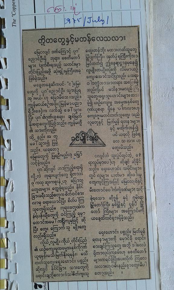ေၾကးမုုံသတင္းစာတြင္ “တုုိ႕တေတြနဲ႕မတန္ေလသလား“ ဟူေသာ စာတစ္ပုုဒ္ကုုိေရးသားခဲ့သည္။ ထုုိစာပါလာေသာ ေၾကးမုုံသတင္းစာကုုိ ပုုသိမ္တြင္ ေရာက္ရွိေနခဲ့ၾကေသာ ကၽြန္မတုုိ႕အတူဖတ္ခဲ့ၾကရသည္။ စာထဲတြင္ ၁၉၇၅ခုုႏွစ္ ေမလ ၇ရက္ေန႕ ညေန ၆နာရီ၃၅မိနစ္တြင္ လွဴပ္ခဲ့ေသာငလ်င္သည္ ပုဂံျပည္က ဘုုရားမ်ားကိုု ပ်က္ဆီးသြားေစခဲ့ျပီ၊ သူ႕ေျမးကေလးေတြ အရြယ္ေရာက္လာရင္ ပုုဂံျပည္ကုုိ ေခၚကာ ဂုုဏ္ယူဖြယ္ေကာင္းလွသည့္ ေရွးအေမြအနစ္မ်ားရွိရာ ပုုဂံျပည္က ေစတီပုုုုထုုိးမ်ားကုုိ လုုိက္ျပဖုုိ႕ စိတ္ကူးယဥ္အိပ္မက္ ပ်က္ခဲ့ေလျပီဟုု ဆုုိသည္။