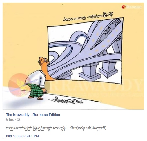 ကာတြန္း သီဟ (စခန္းသစ္) ရဲ႕ ဧရာဝတီ ကာတြန္း “တည္ေဆာက္ျပဳျပင္ ျမန္ျပည္တခြင္” က သရုပ္ေဖာ္ ေကာင္းတယ္။ ဒါေပမယ့္ ဖ်က္သြားတာက — စာမဲ့ ကာတြန္းစစ္စစ္ ျဖစ္ရမွာကို ဒီေခတ္ရဲ႕ တလြဲ ေၾကာက္ရမႈေၾကာင့္ Self-censorship လုပ္ရၿပီး အထိမခံ ေရႊပန္းကန္မ်ား အဆဲဒဏ္လြတ္ေအာင္ “၂၀၁၀-၂၀၁၅ လမ္းတံတား စီမံကိန္း” စသား ထိပ္ကပိတ္ ထည့္ထားတာက ရုပ္ဆိုးသြားတယ္။