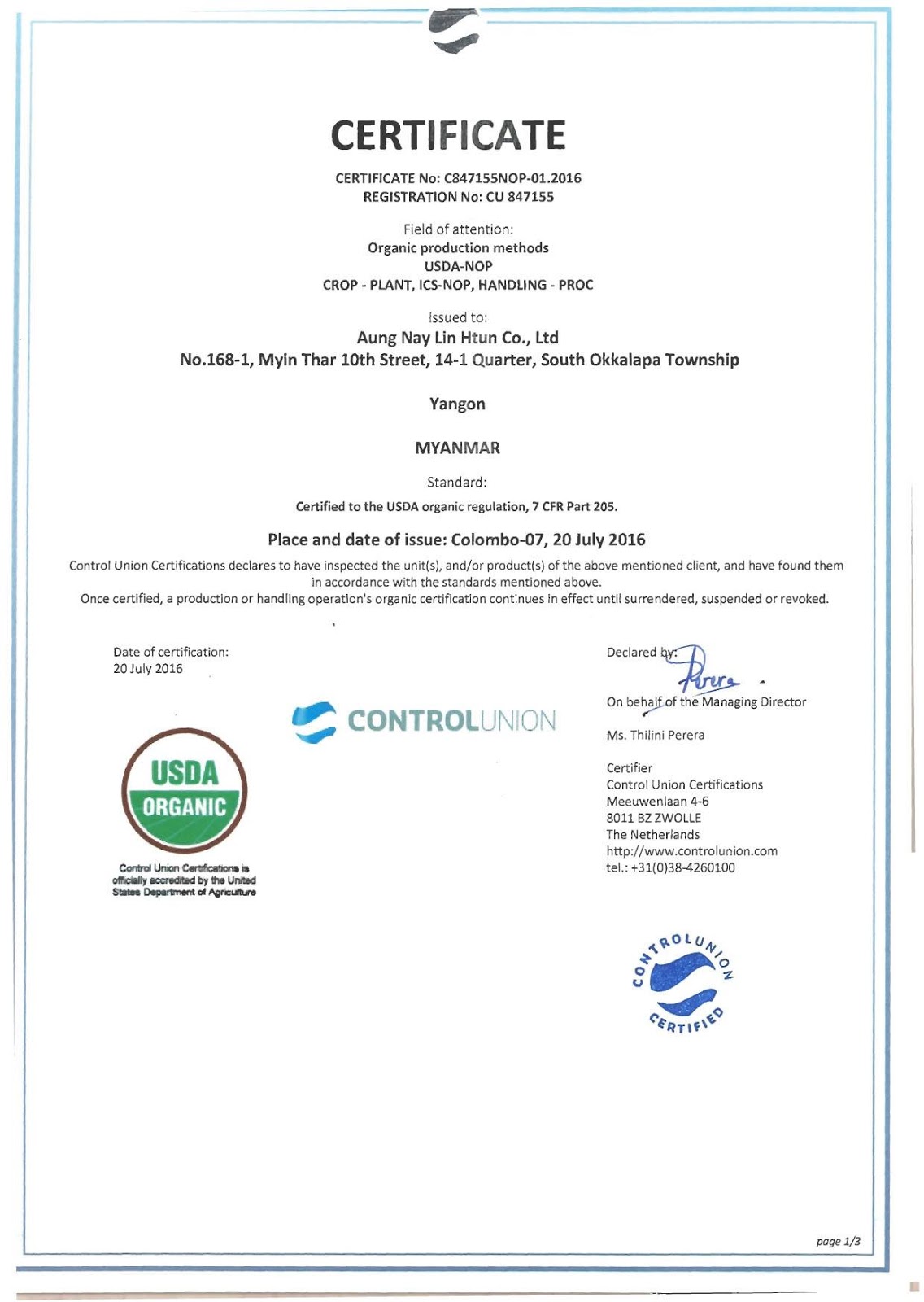 Control Union က အေမရိကန္ႏွင့္ ဥေရာပနိုင္ငံမ်ား၏ စံခ်ိန္စံညႊန္းမ်ားအတိုင္း လိုက္နာေၾကာင္း ခ်ီးျမွင့္ခဲ့သည့္ ၾသဂဲနစ္ လက္မွတ္ |