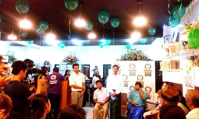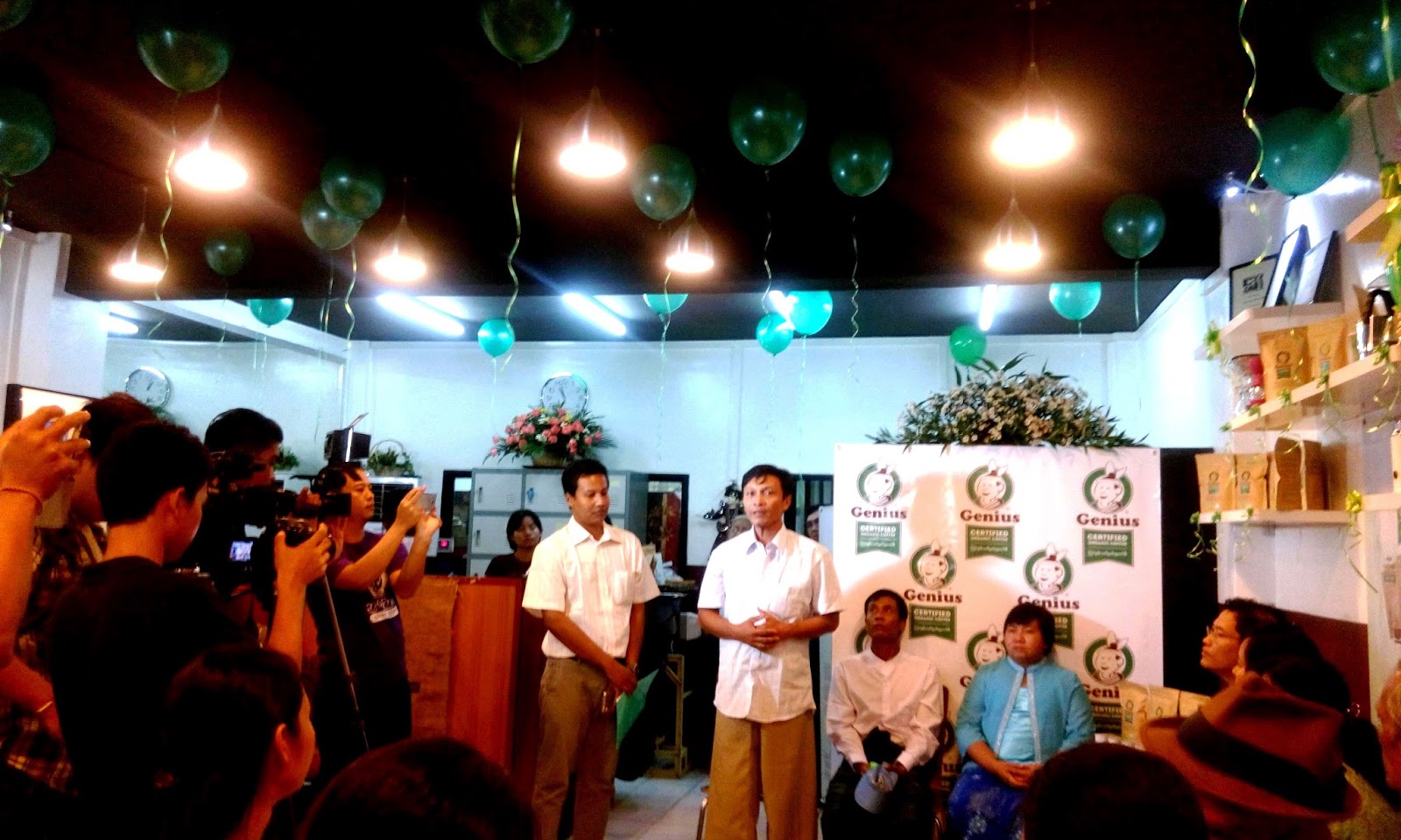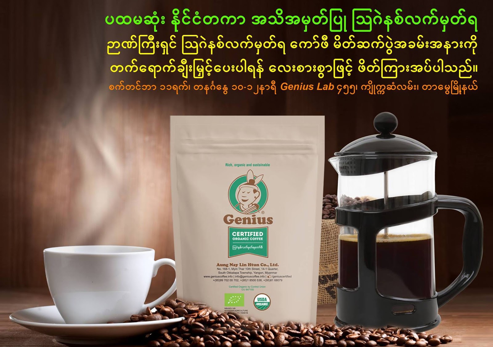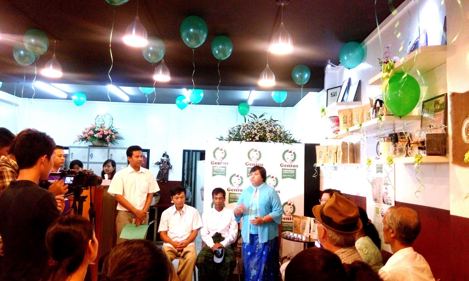 ဉာဏ္ႀကီးရွင္ ရွမ္းေတာင္ျမင့္ ေကာ္ဖီလုပ္ငန္းက ဓါတုေဗဒ ပစၥည္းမ်ား ကင္းစင္သည့္ သဘာဝ စစ္စစ္ ၾသဂဲနစ္ေကာ္ဖီ အသစ္ စတင္ ထုတ္လုပ္ ျဖန္႔ခ်ိသည့္ မိတ္ဆက္ပြဲ အခမ္းအနားကို စက္တင္ဘာလ ၁၁ ရက္ ယေန႔ နံနက္ ၁၀ နာရီတြင္ ဉာဏ္ႀကီးရွင္ ေကာ္ဖီဆိုင္ခြဲ တခုျဖစ္သည့္ တာေမြ က်ိဳကၠဆံလမ္း၊ အမွတ္ ၄၅၅ ရွိ Genius Lab Cafe/Coffee Training ၌္ ျပဳလုပ္ခဲ့သည္။