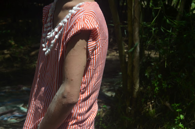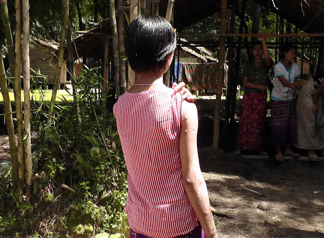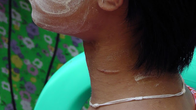 ဘက္ဘက္လက္ဖ်ံေပၚရွိ အမာရြတ္အဝိုင္းမွာ ဆိုင္ပိုင္ရွင္၏သား ကိုရာဇာထြန္းက သူ႔ကို ခ်ဳပ္ထားေပးၿပီး ေဒၚစုမြန္လတ္က မီးရွိဳ႔ခဲ့ေသာေၾကာင့္ ရရိွေသာဒဏ္ရာျဖစ္ေၾကာင္း အျခားအိမ္အကူတစ္ဦးထက္ ပိုမိုႏိွပ္စက္ခံရေသာ မစန္းေကခိုင္က ေျပာၾကားသည္။