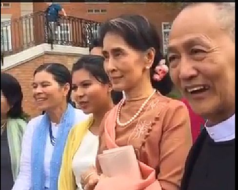 စက္တင္ဘာ ၁၆ ရက္ေန႕က ၀ါရွင္တန္ဒီစီ၊ ေဒၚေအာင္ဆန္းစုုၾကည္ ခရီးစဥ္တခုုမွာ ႏိုုင္ငံေရးလုုပ္ေဖာ္ကိုုင္ဖက္ NLD၏ အေ၀းေရာက္ညြန္႔ေပါင္းအစုုိးရ၏ ၀န္ၾကီးခ်ဳပ္ေဟာင္း ေဒါက္တာစိန္၀င္းနဲ႔ ေတြ႔ဆုုံႏိုုင္ခဲ့ၾကပါတယ္။ ေဒၚေအာင္ဆန္းစုုၾကည္နဲ႔ ေဒါက္တာစိန္၀င္း တိုု႔ဟာ က်ဆုုံးခဲ့ေလျပီးေသာ လြတ္လပ္ေရးေခါင္းေဆာင္ ဗိုုလ္ခ်ဳပ္ေအာင္ဆန္း နဲ႔ အာဇာနည္ ဦးဘ၀င္း ညီအကိုု ႏွစ္ဦးရဲ့ သားသမီးမ်ား ျဖစ္ၾကတဲ့အတြက္ ႏွစ္၀မ္းကြဲ ေမာင္ႏွမလည္း ျဖစ္ၾကပါတယ္။ စက္တင္ဘာ ၁၆ ရက္ေန႔မွာေတာ့ ၀ါရွင္တန္ဒီစီအနီးက အေမရိကန္အထက္တန္းေက်ာင္း ေလ့လာေရးခရီးစဥ္အျပီး ကားေပၚမတက္ခင္ လမ္းေပၚမွာပဲ ေက်ာင္းဆရာေဟာင္း ေဒါက္တာစိန္၀င္းနဲ႔ ေဒၚေအာင္ဆန္းစုုၾကည္တို႔ ေခတၱ ေတြ႔ဆုံခဲ့ၾကတာပါ။