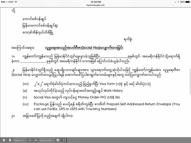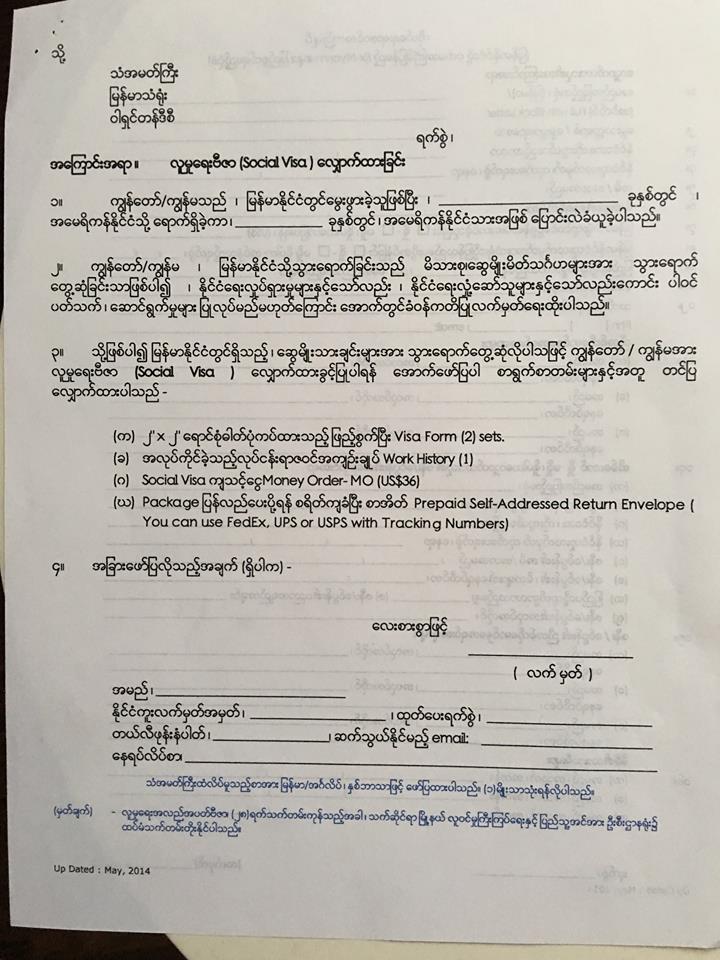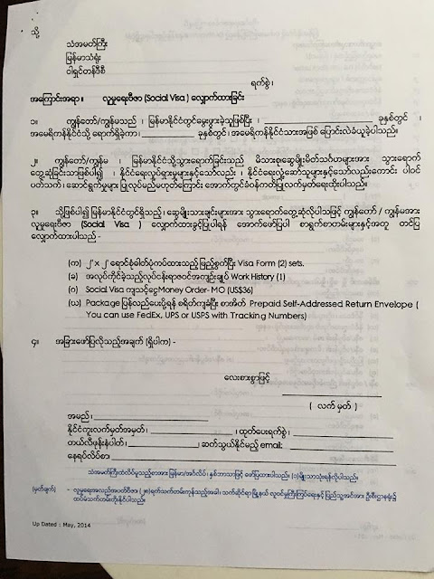 ယခုအစုိးရ တက္လာျပီးေနာက္ပိုင္းတြင္ “ျမန္မာႏိုင္ငံအားဆန္႔က်င့္သည့္ အလုပ္မ်ား မလုပ္ပါ” ဟူ၍ ေျပာင္းလဲ ျပင္ဆင္ထားသည့္ ေလ်ာက္လႊာ ကို ၀ါရွင္တန္ရွိ ျမန္မာသံရုံးက (မၾကာေသးမီက) ထုတ္ျပန္ထားသည္ဟု ဆိုၾကျပန္သည္။ အဆိုပါ ေလ်ာက္လႊာအသစ္တြင္ အေမရိကန္ႏိုင္ငံကူးလက္မွတ္အျပင္ အေမရိကန္ ခရီးသြားလက္မွတ္ပါ အက်ဳံး၀င္သည္ဟု ဆိုထားသည္ကို ေတြ႔ရသည္။