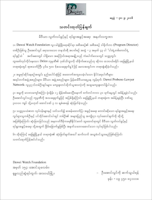 ၂။ အမႈရင္ဆုိင္ေနစဥ္အတြင္း နည္းေပါင္းစုံျဖင့္ အေထာက္အကူေပးခဲ့ပါေသာ ႏုိင္ငံေရးပါတီမ်ား၊ အရပ္ဘက္အဖြဲ႕အစည္းမ်ား၊ မီဒီယာ အဖြဲ႕အစည္းမ်ား၊ ျမန္မာမီဒီယာေရွ႕ေန ကြန္ရက္၊ Dawei Probono Lawyer Network၊ လူပုဂၢိဳလ္တစ္ဦးခ်င္းမ်ား၊ ေက်းဇူးတင္ထုိက္သူအားလုံးကုိ အထူးေက်းဇူးတင္ရွိပါသည္။
