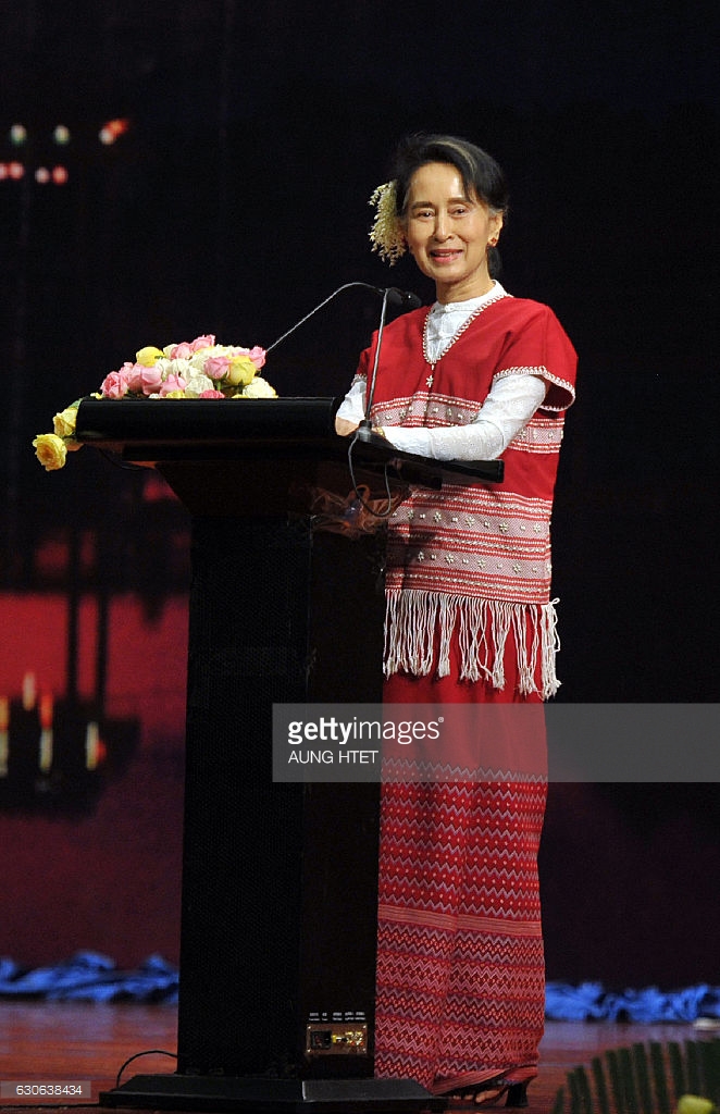| Myanmar’s State Counsellor Aung San Suu Kyi speaks during Karen New Year celebrations in Naypyidaw on December 29, 2016. / AFP / AUNG |