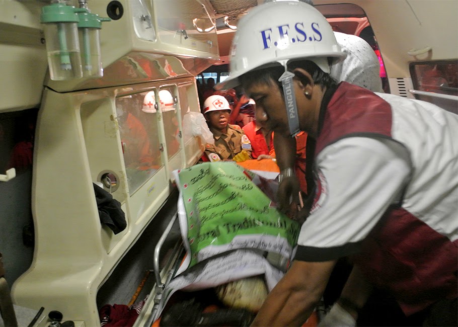 ၇.၁၂.၂ဝ၁၃ ရက္ေန႔တြင္ ကၽြန္ေတာ္သည္ မႏၲေလးၿမိဳ႕သို႔ ပရဟိတလုပ္ငန္းကိစၥရပ္ျဖင့္ သြား ေရာက္ရန္အတြက္ အျပည္ျပည္ဆိုင္ရာ မဂၤလာဒံုေလဆိပ္သို႔ေရာက္႐ိွစဥ္ ကၽြန္ေတာ္၏ တယ္လီဖုန္းထံ အေရးေပၚအကူအညီေတာင္းမႈ တစ္ခုၾကားသိခဲ့ရသည္။ မိေက်ာင္းကန္ရပ္ကြက္ေန ျပည္သူလူထုတို႔ႏွင့္ တပ္ၿမိဳ႕စည္ပင္ (အနက္ေရာင္ဝတ္စံုဝတ္သူ) တို႔ႏွင့္ ပဋိပကၡျဖစ္ပြားခဲ့ရာ ဒဏ္ရာရ႐ိွခဲ့ေသာ ျပည္သူလူထု (၁၂) ေယာက္၊ စိုးရိမ္ရသူ (၆) ဦးတို႔အား အေရးေပၚစံျပေဆး႐ံုသို႔ ပို႔ေဆာင္ကုသေပးမႈတို႔အား ကူညီေဖးမ ေပးခဲ့သည္။ ထို႔ေနာက္ ၉.၁၂.၂ဝ၁၃ ရက္ေန႔ ညတြင္လည္း ယင္းမိေက်ာင္းကန္ရပ္ကြက္အား စစ္တပ္ေျမ ျဖစ္သည့္အတြက္ ညေန (၆) နာရီေနာက္ဆံုးထား ႐ုပ္သိမ္းေပးရန္ သဃၤန္းကၽြန္းၿမိဳ႕နယ္ အေထြေထြ အုပ္ခ်ဳပ္ေရးမွဴးႏွင့္ တပ္ၿမိဳ႕စည္ပင္မွ အၿပီးအပိုင္ဖယ္႐ွားမႈ မျပဳလုပ္ခဲ့ေသာေၾကာင့္ မလိုလားအပ္ေသာ ပဋိပကၡမ်ားထပ္မံ၍ ျဖစ္ေပၚလာပါက ကၽြန္ေတာ္တို႔ ပရဟိတသမားမ်ားအေနျဖင့္ အေရးေပၚလူနာတင္ ယာဥ္ႏွင့္ ကယ္ဆယ္ေရးအဖြဲ႔ဝင္တို႔အား မိေက်ာင္းကန္ရပ္ကြက္ အနီးပတ္ဝန္းက်င္သို႔ ေစလႊတ္ၿပီး အသင့္ အေနအထား ေစာင့္ဆိုင္းေနခဲ့သည္။ သို႔ေသာ္ ည (၁၂းဝဝ) နာရီအခ်ိန္ထိ မည္သည့္ျပႆနာ တစ္စံု တစ္ရာမွ မေပၚေပါက္ခဲ့ေသာ္လည္း ၁ဝ.၁၂.၂ဝ၁၃ ရက္ေန႔ နံနက္ (၁းဝဝ) နာရီအခ်ိန္တြင္ ဆက္သြယ္ေရး စကားေျပာစက္မွ သဃၤန္းကၽြန္းၿမိဳ႕နယ္႐ိွ မရမ္းကုန္းၿမိဳ႕နယ္၊ ေဝဇယႏၲာလမ္းႏွင့္ ဂႏၶမာလမ္းေထာင့္႐ွိ Gandamar Whole Sale တတိယထပ္တြင္ မီးေလာင္ကၽြမ္းမႈျဖစ္ပြားေၾကာင္း ၾကားသိခဲ့ရသည့္အတြက္ လွ်င္ျမန္စြာ သြားေရာက္ခဲ့သည္။ မိနစ္ပိုင္းအတြင္း ကယ္တင္မႈျပဳလုပ္ႏိုင္ရန္အတြက္ ေရာက္႐ိွသြားေသာ္ လည္း မီးေလာင္ကၽြမ္းမႈသည္ အေဆာက္အဦးျပင္ပတြင္ ေလာင္ကၽြမ္းျခင္းမဟုတ္ဘဲ အေဆာက္အဦး အတြင္းပိုင္းတြင္ ေလာင္ကၽြမ္း၍ ေသဆံုးေနေသာ က်ား/မခြဲျခား၍မရႏိုင္ေသာ ႐ုပ္အေလာင္း (၇) ေလာင္း ကို ေၾကကြဲစြာျဖင့္သာ ေတြ႔႐ိွရေတာ့သည္။ ထို႔ေၾကာင့္ မီးသတ္ရဲေဘာ္မ်ား၊ ၾကက္ေျခနီရဲေဘာ္မ်ားႏွင့္ အတူပူးေပါင္း၍ ေသဆံုးသြားေသာအေလာင္းမ်ားအား ကၽြန္ေတာ္တို႔တြင္ပါ႐ိွေသာ လူနာတင္ယာဥ္ျဖင့္သာ သယ္ေဆာင္၍ မ/ဥကၠလာပျပည္သူ႔ေဆး႐ံုသို႔ ပို႔ေဆာင္ေပးခဲ့ပါသည္။