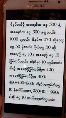 အမွန္က 1000 အကိုက္ပါပဲ။ ဒါေပမဲ့ အေဖ့ကို ျပန္ဆပ္ဖို႔ 490၊ အေမ့ကို ျပန္ဆပ္ဖို႔ 490 ဆိုၿပီး စဥ္းစားတဲ့အခါ (490 + 490 + လက္က်န္ 10 = 990 ဆိုၿပီး) 10 ေပ်ာက္သြားပါတယ္။