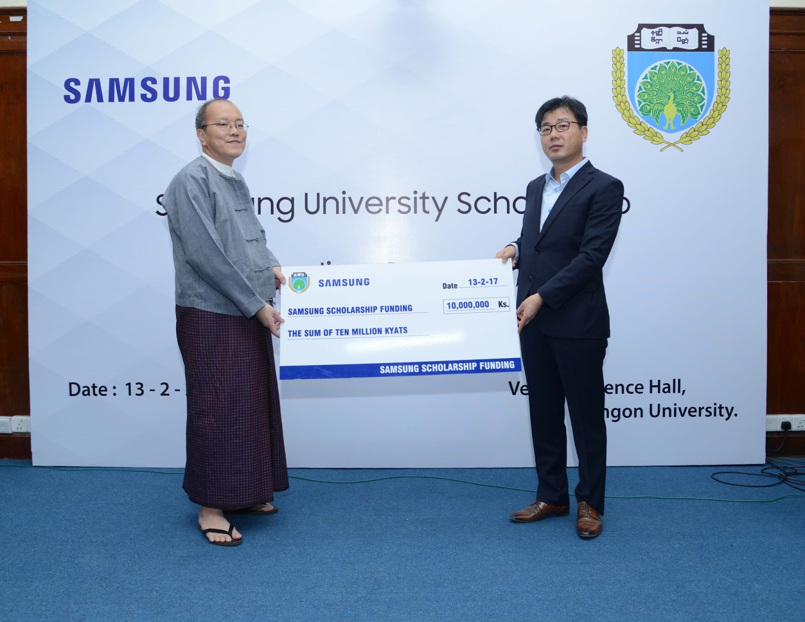 ရန္ကုန္၊ျမန္မာ – ေဖေဖာ္၀ါရီလ ၁၃ ရက္၊ ၂၀၁၇ ။ ။ ပညာေရးႏွင့္ သက္ဆိုင္သည့္ လူမႈအက်ိဳးျပဳပိုင္းဆိုင္ရာ လုပ္ငန္းမ်ားကို ျမန္မာႏိုင္ငံတြင္ စဥ္ဆက္မျပတ္လုပ္ေဆာင္လ်က္ရွိသည့္ Samsung Myanmar မွ ယခုႏွစ္တြင္ ရန္ကုန္တကၠသိုလ္၊ ကြန္ပ်ဴတာဌာန မွ ထူးခြ်န္ေက်ာင္းသား၊ ေက်ာင္းသူမ်ားအတြက္ပညာသင္ၾကားစရိတ္ ေထာက္ပံ့ေပးမည့္ ပညာသင္ဆု ရန္ပံုေငြ အား ျမန္မာေငြက်ပ္ သိန္း ၁၀၀ ျဖင့္ စတင္မတည္လိုက္ေၾကာင္း ယေန႔ သတင္းထုတ္ျပန္ေၾကညာလိုက္သည္။ အဆိုပါ ပညာသင္ဆုရန္ပံုေငြလွဴဒါန္းပြဲအား ေဖေဖာ္၀ါရီလ ၁၃ ရက္၊ တနလာၤေန႔ ၊ ေန႔လည္ ၃ နာရီတြင္ ရန္ကုန္တကၠသိုလ္ သိပၸံခန္းမ၌ က်င္းပျပဳလုပ္ခဲ့ၿပီး ရန္ကုန္တကၠသိုလ္မွ ပါေမာကၡခ်ဳပ္၊ ဒုတိယပါေမာကၡခ်ဳပ္မ်ား၊ ပါေမာကၡဌာနမွဴမ်ား၊ ဆရာ၊ ဆရာမမ်ား၊Samsung Myanmar မွ တာ၀န္ရွိသူမ်ား ၊ ေက်ာင္းသား၊ေက်ာင္းသူမ်ား ႏွင့္ ဖိတ္ၾကားထားေသာ မီဒီယာမ်ားတက္ေရာက္ခဲ့ၾကသည္။