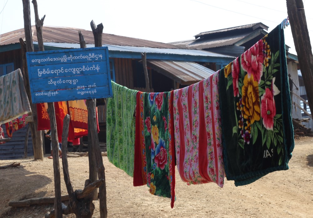 kk – သီဖူးလ္ရြာတြင္ ျမစိမ္းေရာင္ စီမံကိန္း ရိွေနေၾကာင္း အမွတ္အသား ျပဳထားသည့္ ဆိုင္းဘုတ္တစ္ခုအနီး ေစာင္မ်ား လွန္းထားသည္။ ခ်င္းေဒသသည္ ရာသီဥတု ၾကမ္းတမ္းသည့္ ေဒသတစ္ခု ျဖစ္သည္။