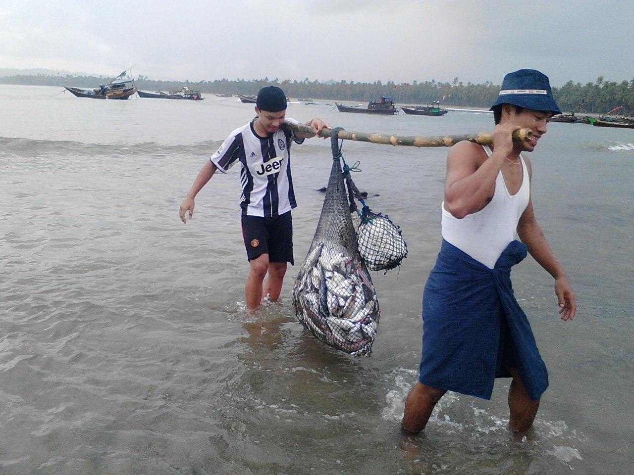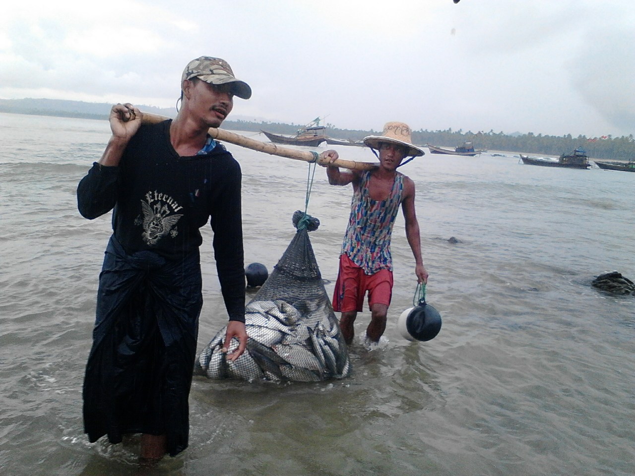 ဇြန္ ၇ ရက္ေန႔က ေစ်းကြက္ပို႔မယ့္ငါးေတြကို ငါးဖမ္းေလွကေန သြားေရာက္ သယ္ေဆာင္လာၾကတဲ့ ေငြေဆာင္ၿမိဳ႕က ေရလုပ္သား ႏွစ္ဦး (ဓာတ္ပံု – Myanmar Now)