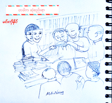 “ဟိုိုမွာ စာအုပ္ဆိုင္ေလး၊ စာအုပ္ဆိုင္ေလး” ဟု။