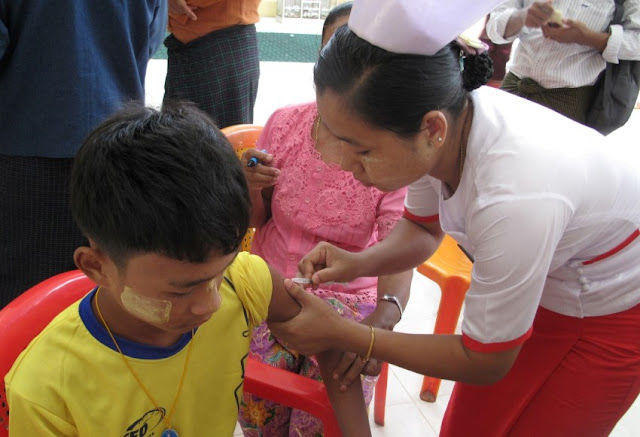 ဝက္သက္ေရာဂါျဖစ္ပြားေသာ ဒုကၡသည္ကေလးတစ္ဦး ေဆးရံုတင္ ကုသမႈ ခံယူေနရသျဖင့္ စစ္ေတြၿမိဳ႕ မဟာေဇယ်သိဒၶိအဓိ႒ာန္ေက်ာင္းတိုက္ေရာက္ ကေလးမ်ားကို စက္တင္ဘာ ၉ ရက္ေန႔က ဝက္သက္ကာကြယ္ေဆးထိုးေပးလ်က္ရိွသည္