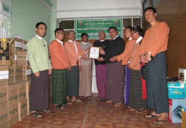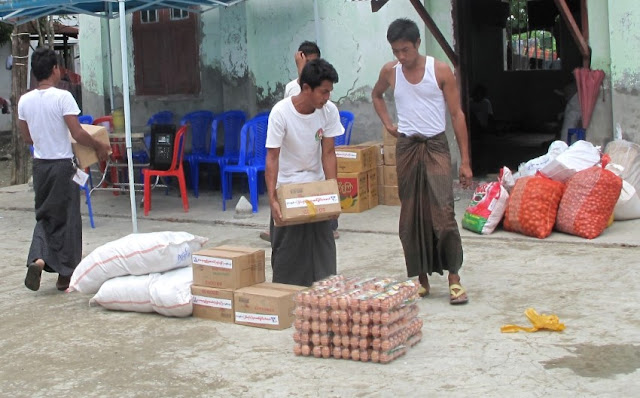 စက္တင္ဘာ ၉ ရက္ေန႔ နံနက္ပိုင္းက စစ္ေတြၿမိဳ႕ ဓမၼာရာမေက်ာင္းတိုက္ ေရာက္လာေသာ ရန္ကုန္နာေရးကူညီမႈအသင္း၏ ေထာက္ပံ့မႈမ်ားကို ေရႊ႕ေျပာင္းေနၾကသူမ်ား။အနယ္နယ္မွ အရပ္ဘက္အဖဲြ႔အစည္းမ်ားက စစ္ေတြၿမိဳ႕အႏံွ႔အျပားရိွ ယာယီဒုကၡသည္စခန္းမ်ားကို ဆက္သြယ္ၿပီး အကူအညီေပးလ်က္ရိွသည္။