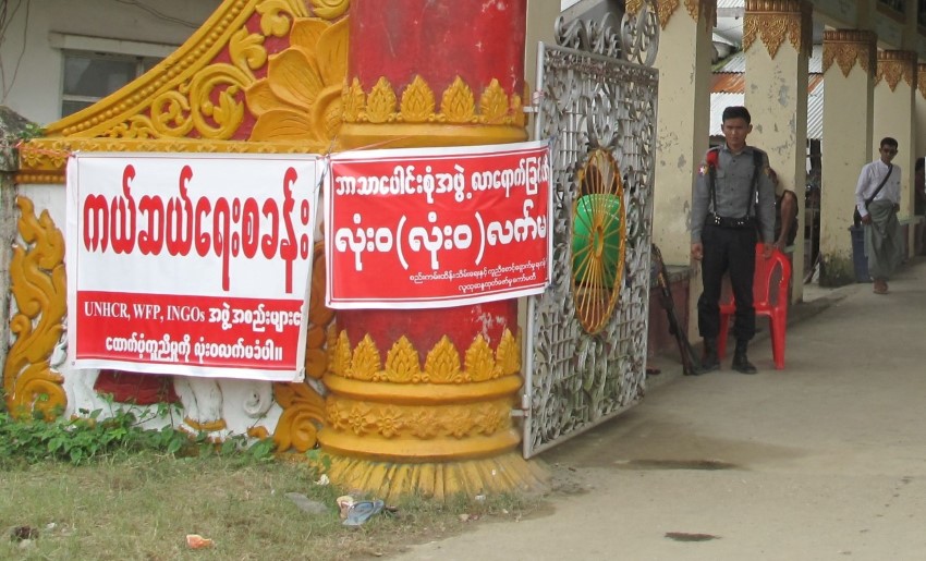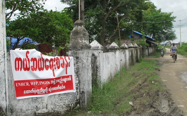 ႏိုင္ငံတကာအဖဲြ႔မ်ား၏ကူညီမႈကိုလက္မခံပါဟူေသာ ပံုစံတူဆိုင္းဘုတ္ကို ဓမၼာရာမေက်ာင္းတိုက္အျပင္ စစ္ေတြရိွ တျခားေသာ ယာယီဒုကၡသည္စခန္းမ်ားတြင္လည္း ေတြ႔ႏိုင္သည္