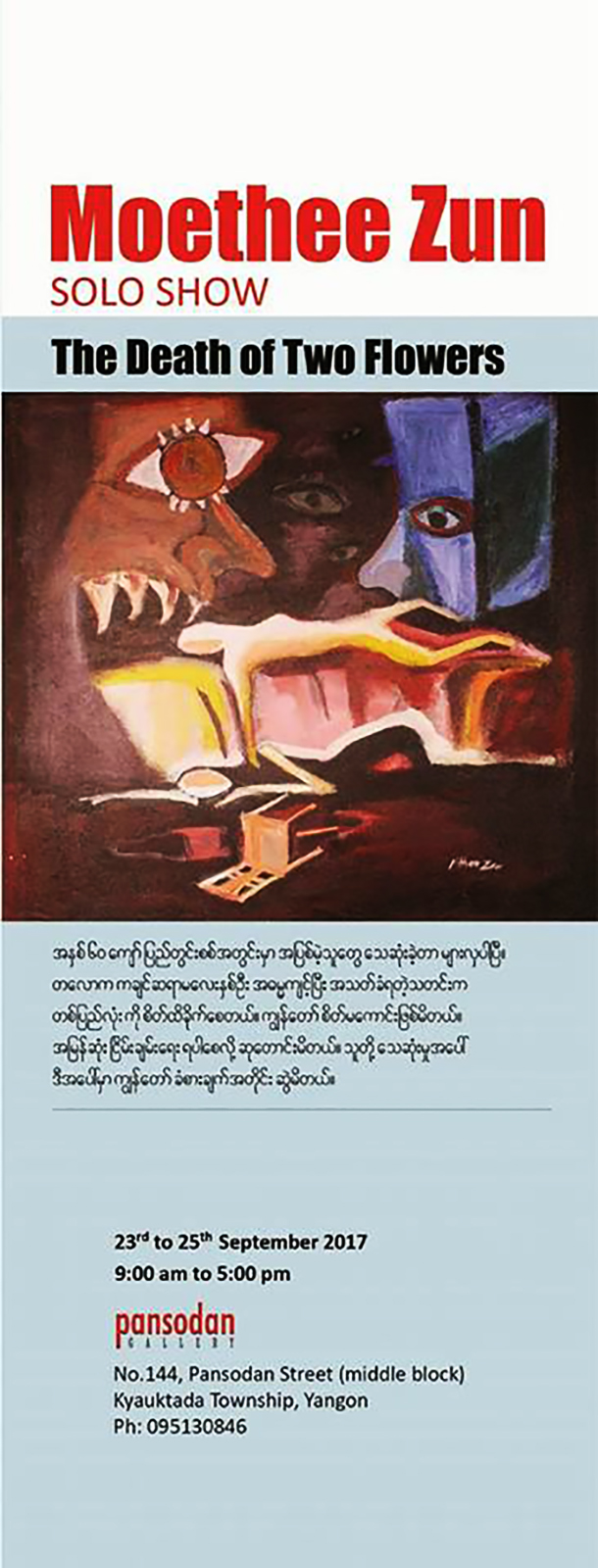 မိုးသီးဇြန္က သူရဲ႕ တကိုယ္ေတာ္ The Death of Two Flowers လို႔အမည္ေပး ထားပါ တယ္။ ပန္းခ်ီျပပြဲနဲ႔ပတ္သက္ၿပီး သူ႔ရဲ႕”စကားဦး” ဒီလိုနားေထာင္ၾကည့္ျမင္ႏိုင္ဖုိ႔နဲ႔ သူ႔ရဲ႕ပန္းခ်ီကားတခ်ဳိ႕ကို ဒီေနရာကေန ေဖာ္ျပ ေပးလိုက္ပါတယ္။