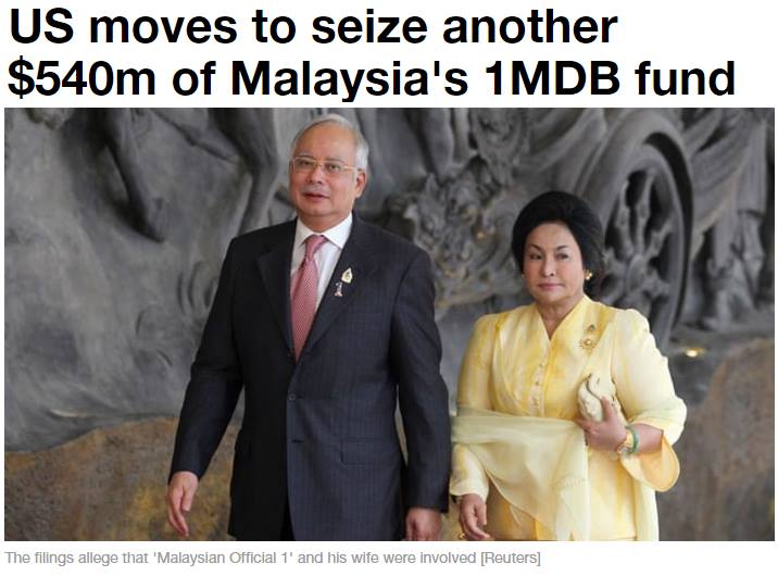 အေမရိကန္အစိုးရကေတာ့ ယခင္ သမၼတအိုဘားမား နဲ႕ ယခုသမၼတေဒၚနယ္ထရန္ တို႕က အဂတိလိုက္စားမႈ ဥပေဒ အေျပာင္းလဲမရွိ၊ မေလးရွား၀န္ၾကီးခ်ဳပ္ နာဂ်စ္ နဲ႕ အစိုးရအဖြဲ႕ကို ရံႈ႕ခ်ပါတယ္။ အဂတိ ဘဏ္ေငြစာရင္းမ်ားကို ေဖၚထုတ္ပါတယ္။ အေမရိကန္တရားေရး၀န္ၾကီးဌာန The US Department of Justice က ၀န္ၾကီးခ်ဳပ္ ဆြဒ္ဇာန္ ဘဏ္အေကာင့္ထဲ ၀င္လာတဲ့ပိုက္ဆံ ေတြကို ထည့္ေပးတဲ့ ေဒၚလာသန္း၅၄၀ အပါ၀င္ စုစုေပါင္း US$ 4.5 billion ကန္ေဒၚလာ သန္းေပါင္း ၄၅၀၀ ကို ျပန္ေပးဖို႕ ေတာင္းဆိုပါတယ္။ ၂၀၁၇ ဇြန္လမွာမွာ Aljazeera သတင္းဌာနက အေမရိကန္အစိုးရ ထုတ္ျပန္ခ်က္ကို ေဖာ္ျပထားပါတယ္။
