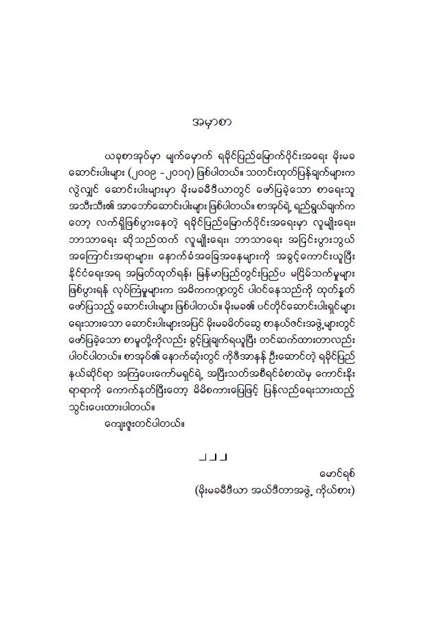ယခုစာအုပ္မွာ မ်က္ေမွာက္ ရခိုင္ျပည္ေျမာက္ပိုင္းအေရး မိုးမခေဆာင္းပါးမ်ား (၂၀၀၉ -၂၀၁၇) ျဖစ္ပါတယ္။ သတင္းထုတ္ျပန္ခ်က္မ်ားကလြဲလ်င္ ေဆာင္းပါးမ်ားမွာ မိုးမခမီဒီယာတြင္