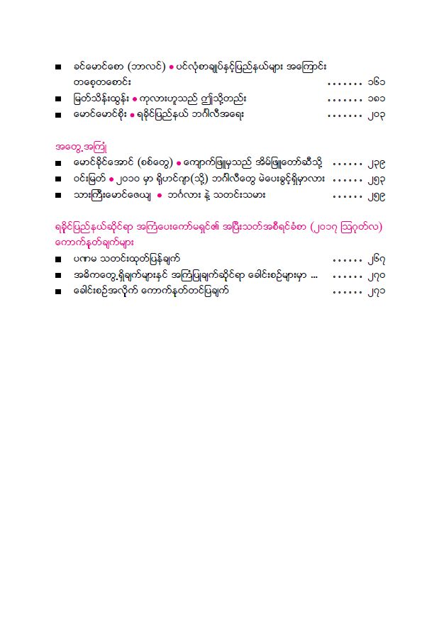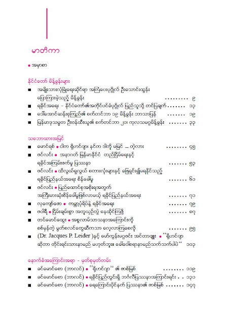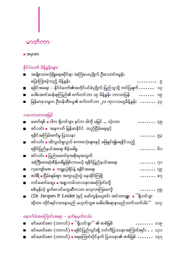 မိုးမခ၏ ပင္တိုင္ေဆာင္းပါးရွင္မ်ား ေရးသားေသာ ေဆာင္းပါးမ်ားအျပင္ မိုးမခမိတ္ေဆြ စာနယ္ဇင္းအဖြဲ႔မ်ားတြင္ ေဖာ္ျပခဲ့ေသာ စာမူတို႔ကိုလည္း ခြင့္ျပဳခ်က္ရယူျပီး တင္ဆက္ထားတာလည္း ပါ၀င္ပါတယ္။ စာအုပ္၏ ေနာက္ဆုံးတြင္ ကိုဖီအာနန္ ဦးေဆာင္တဲ့ ရခိုင္ျပည္နယ္ဆိုင္ရာ