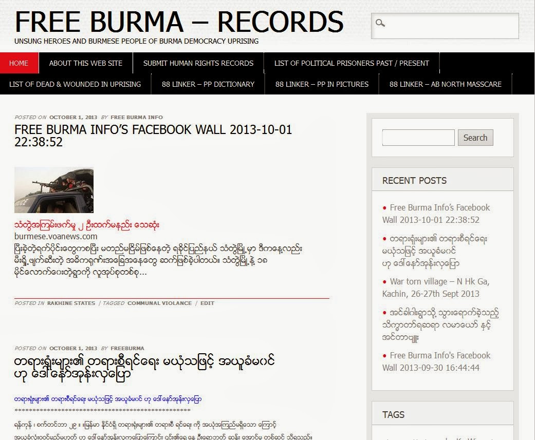 ေနာက္ ျမန္မာျပည္တြင္းက activism, rights, advocacy နဲ႔ဆိုင္တဲ့ သတင္းေတြ၊ မွတ္တမ္းေတြ စုဖို႔ လုပ္ေနတဲ့ Free Burma Info (http://freeburma.info ) သူ႔ေဖစ္ဘြတ္ကေတာ့ (https://www.facebook.com/FreeBurmaInfo?ref=hl )