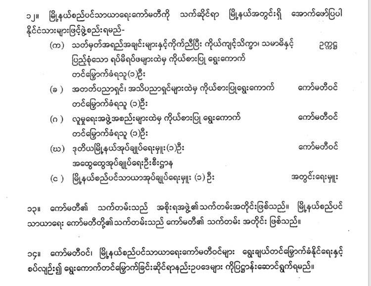 ဥပေဒမူၾကမ္းမွာ COI မကင္းသူေတြ ေကာ္မတီဝင္ျဖစ္ခြင့္ တားျမစ္ထားတဲ့ ပုဒ္မေတြ ပါရပါ့မယ္။ ေဖါက္ဖ်က္ က်ဴးလြန္သူကို အျပစ္ေပးတဲ့ ျပစ္ဒါဏ္ေတြ ပါရပါ့မယ္။ ေကာ္မတီဝင္ (၁၀) ဦးလံုးဟာ ေရြးေကာက္ခံျဖစ္ရပါ့မယ္။
