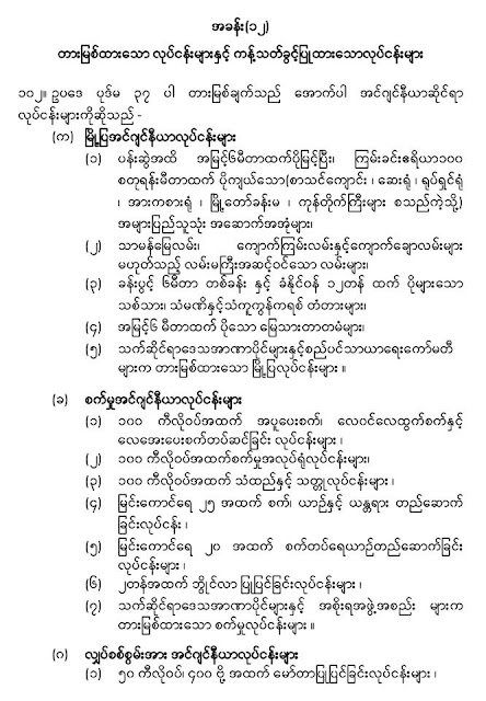 (ရွင္းလင္းခ်က္။ ။ အထက္ေဖၚျပပါ ပုဒ္မခြဲ (၁) (၂) (၃) (၄) တို႔ျဖင့္ တားျမစ္၊ ခြင့္ျပဳထားေသာ လုပ္ငန္းမ်ားမွတပါး ေဒသအာဏာပိုင္မ်ားႏွင့္ စည္ပင္မွ တားျမစ္ထားေသာ လုပ္ငန္းမ်ား။)
