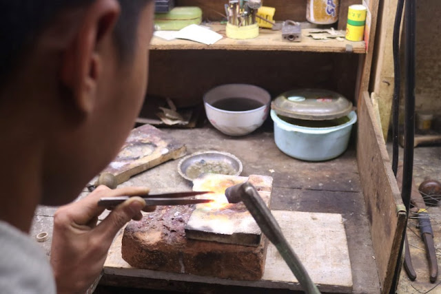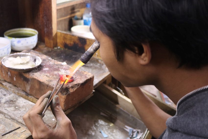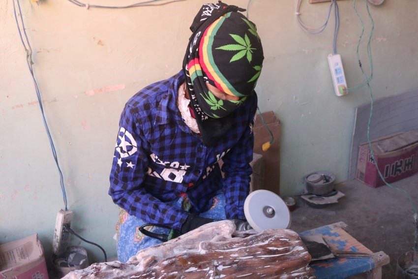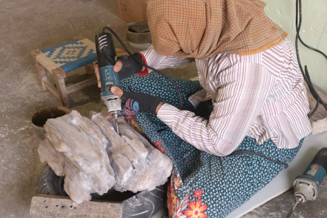 အင္ၾကင္းေက်ာက္ကို အေခ်ာထည္ျပဳလုပ္သည့္ ေနရာတြင္ အမ်ဳိးသမီးမ်ား