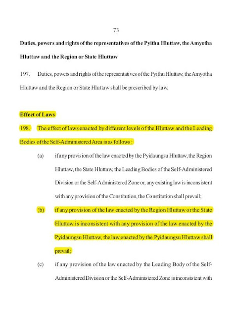 ၁၉၈။ လႊတ္ေတာ္အဆင့္ဆင့္ႏွင့္ ကိုယ္ပိုင္အုပ္ခ်ဳပ္ခြင့္ရ စီရင္စုဦးစီးအဖြဲ႔မ်ားက ျပ႒ာန္းသည့္ ဥပေဒမ်ား၏ အက်ိဳးသက္ေရာက္မႈမွာ ေအာက္ပါအတိုင္းျဖစ္သည္။