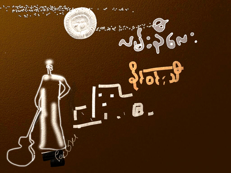 စိန္ပန္းပြင့္ေတြဟာ ဖြဲဖြဲလြင့္လြင့္၊ လေရာင္မႈန္ရီဟာ ဖြဲဖြဲလြင့္လြင့္၊ ၾသဂုတ္လရဲ႕မိုးတိမ္ေတြဟာ ဖြဲဖြဲလြင့္ လြင့္၊ နာက်င္ေၾကကြဲမႈေတြဟာ ဖြဲဖြဲလြင့္လြင့္ …..