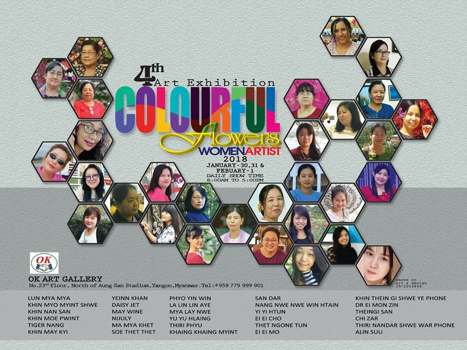 ယခုႏွစ္ အမ်ိဳးသမီးပန္းခ်ီဆရာမ (၃၀) ဦးရဲ ႔ လက္ရာေတြ ပါ၀င္ျပသမယ္႔ စတုတၳအၾကိမ္ Colourful Flowers အမ်ိဳးသမီး ပန္းခ်ီျပပြဲကို လည္း လာေရာက္ၾကည္႔ရွဳအားေပးဖို႔ ဖိတ္ေခၚပါရေစရွင္။