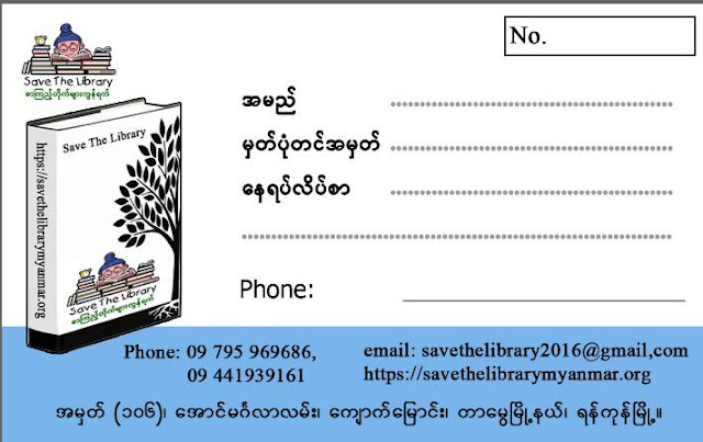 save the library စာၾကည့္တိုက္မ်ား ကြန္ရက္က ႏိႈးေဆာ္ခ်က္ေလးပါ။ မိတ္ေဆြမ်ားကိုု လက္တိုု႔လိုုက္ပါတယ္။