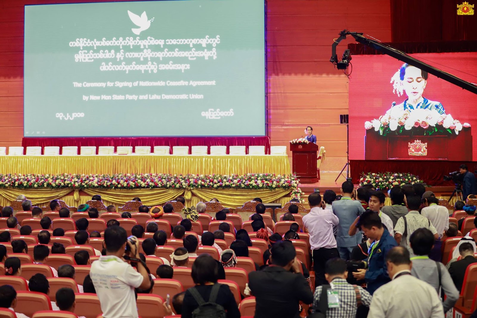 တစ္ႏိုင္ငံလံုးပစ္ခတ္တိုက္ခိုက္မႈရပ္စဲေရးသေဘာတူစာခ်ဳပ္တြင္ မြန္ျပည္သစ္ပါတီနွင့္ လားဟူဒီမုိကရက္တစ္အစည္းအရံုးတို႔ ပါ၀င္လက္မွတ္ေရးထိုးပြဲ အခမ္းအနားတြင္