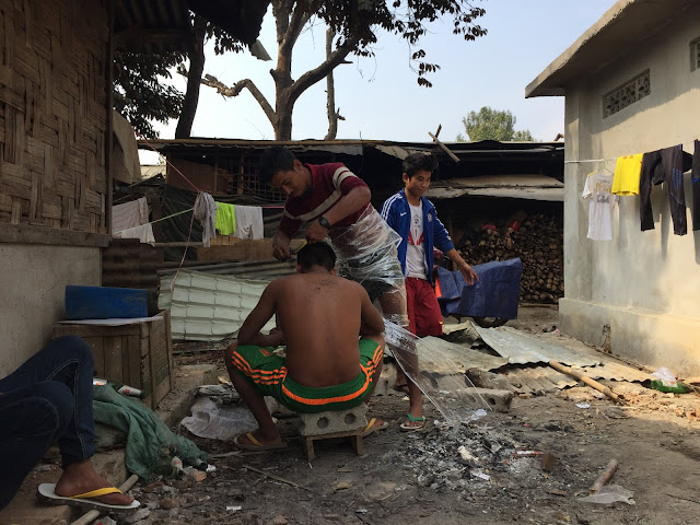 နမ့္ခမ္း – စစ္ေဘးေရွာင္စခန္း တိုု႔မွာ စစ္ေဘးေရွာင္ စခန္းမွာ ေနထိုုင္သူအခ်င္းခ်င္း ဆံပင္ညွပ္ေပးေနတဲ့ ျမင္ကြင္းပါ။ ဆံညွပ္ဆရာ တေယာက္ကေတာ့ ဆံပင္ေတြ ေဘာင္းဘီမွာ ကပ္ညိမွာစိုုးလိုု႔ ေဆာက္လုုပ္ေရး ပစၥည္းေတြကခြာလိုုက္တဲ့ ပလပ္စတစ္ေတြ ခါးမွာပတ္ၿပီး ညွပ္ေနတာကိုုေတြ႕ရမွာပါ။
