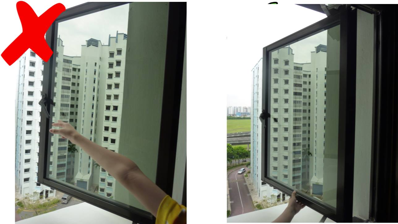 ၃။ ျပတင္းေပါက္အျပင္ဘက္သို႔ အရမ္းမထြက္ရ။ အလြန္ကုန္းၿပီးမလွန္းရ။ ေခြးေျခ၊ အဆင္႔မ်ားေပၚ တက္မရပ္ရ။ ပံု – ၆