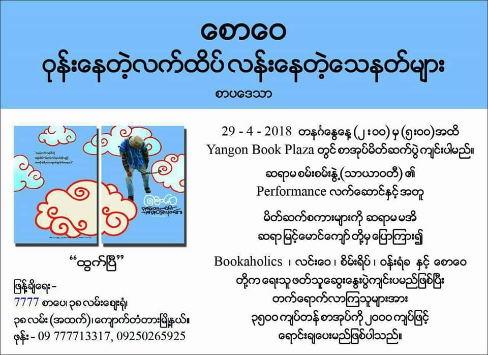 ကဗ်ာဆရာေစာေ၀ စာအုပ္သစ္မိတ္ဆက္ပြဲႏွင့္ေရးသူဖတ္သူေဆြးေႏြးပြဲ Yangon Book Plazaမွာ ျပဳလုပ္မည္။