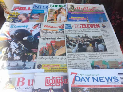ေမ ၂ ရက္ေန႔က ရန္ကုန္ၿမိဳ႕ စာနယ္ဇင္းအေရာင္းဆိုင္တစ္ခုတြင္ ေတြ႔ရေသာ သတင္းစာ၊ ဂ်ာနယ္မ်ား (ေမာ္ေလး/Myanmar Now)
