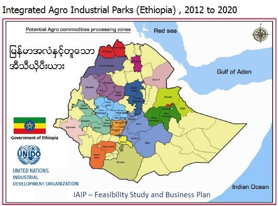 အီသီယိုပီးယားအစိုးရနဲ႔ ကုလသမဂၢ UNIDO ပူးေပါင္းၿပီး လယ္ယာ စက္မႈဇံု ၄ ခု တည္ေဆာက္တဲ့စီမံကိန္းႀကီး (၂ဝ၁၂ မွ စတင္ၿပီး ၂ဝ၂ဝ မွာ ၿပီးဆံုးမယ္။ လယ္ယာအေျချပဳ စက္မႈဇံု Integrated Agro-Industrial Parks Feasibility Study and Business Plan (F.S & B.S) ကို အစိုးရႏွင့္ UNIDO ပူးေပါင္းအေကာင္ထည္ေဖာ္ေနတဲ့ လယ္ယာထြက္ကုန္ အေျချပဳ စက္ မႈဇံု ၄ခု စီမံကိန္း ျဖစ္ပါတယ္။ ေတာင္သူမ်ား ရဲ့ ရြာေတြ မွာ RCT Rural Transform Center စုစုေပါင္း ၂၈ ခု တည္ေဆာက္ ေပးၿပီး၊ RCT မ်ားဝန္းရံလ်က္ IAIP Integrated Agro-Industrial Park + ACPZ Integrated Agri Commodity Procurement Zone မ်ား တည္ေဆာက္မယ္။ ေတာင္သူမ်ား၊ နည္းပညာမ်ား၊ ေစ်းကြက္နဲ႔ အႀကီးစား အင္ဖရာစထရပ္ခ်ာ တည္ေဆာက္ျခင္းျဖစ္ပါတယ္။ စက္မႈဇံုႀကီး (၄) ခုရဲ့ အေျခခံလိုအပ္ခ်က္ျဖစ္တဲ့ လမ္း၊ လွ်ပ္စစ္၊ ေတာင္သူမ်ားရဲ့ သီးႏွံစိုက္ပ်ိဳး ခင္းမ်ားနဲ႔ ဘတ္ဂ်တ္ ေငြေၾကးကုန္က်မႈစာရင္း စီမံကိန္းကုန္က်စရိတ္ ဇံု၄ ခုအတြက္ ဘတ္ဂ်တ္ကေတာ့ …. လယ္ယာ စက္ မႈဇံုအတြက္ ေဒၚလာ ၆၆၃ သန္း …. စပါယ္ရွယ္လုပ္ငန္း + Offsite RTC + Connecting Cost = ေဒၚလာ ၈၆၈ သန္း …. စုစုေပါင္း ေဒၚလာ ၁.၅၃၁ ဘီလ်ံ ျဖစ္ပါတယ္။ အက်ိဳးေက်းဇူး (၂ ႏွစ္၊ ၄ ႏွစ္၊ ၄ ႏွစ္အထက္) မွာ အလုပ္အကိုင္ဘယ္ႏွစ္ခု ဖန္တီးေပးမယ္ဆိုတာ Phase I , ၃၀ ရာခုိင္ႏႈန္း, ၈၀ ရာခုိင္ႏႈန္း, ၉၀ ရာခုိင္ႏႈန္း ၿပီးစီးမႈေတြနဲ႔ ေသခ်ာစြာျပထားပါတယ္။ . အခ်ိန္ကာလကေတာ့ F.S & B.S ၿပီးစီးခဲ့ၿပီး၊ Site Investigation & Engineering လုပ္ေနဆဲျဖစ္ပါတယ္။ အားလံုး Sept-2020 မွာ ၿပီးမယ္လုိ႔ အေသးစိတ္ေရးထားပါတယ္။