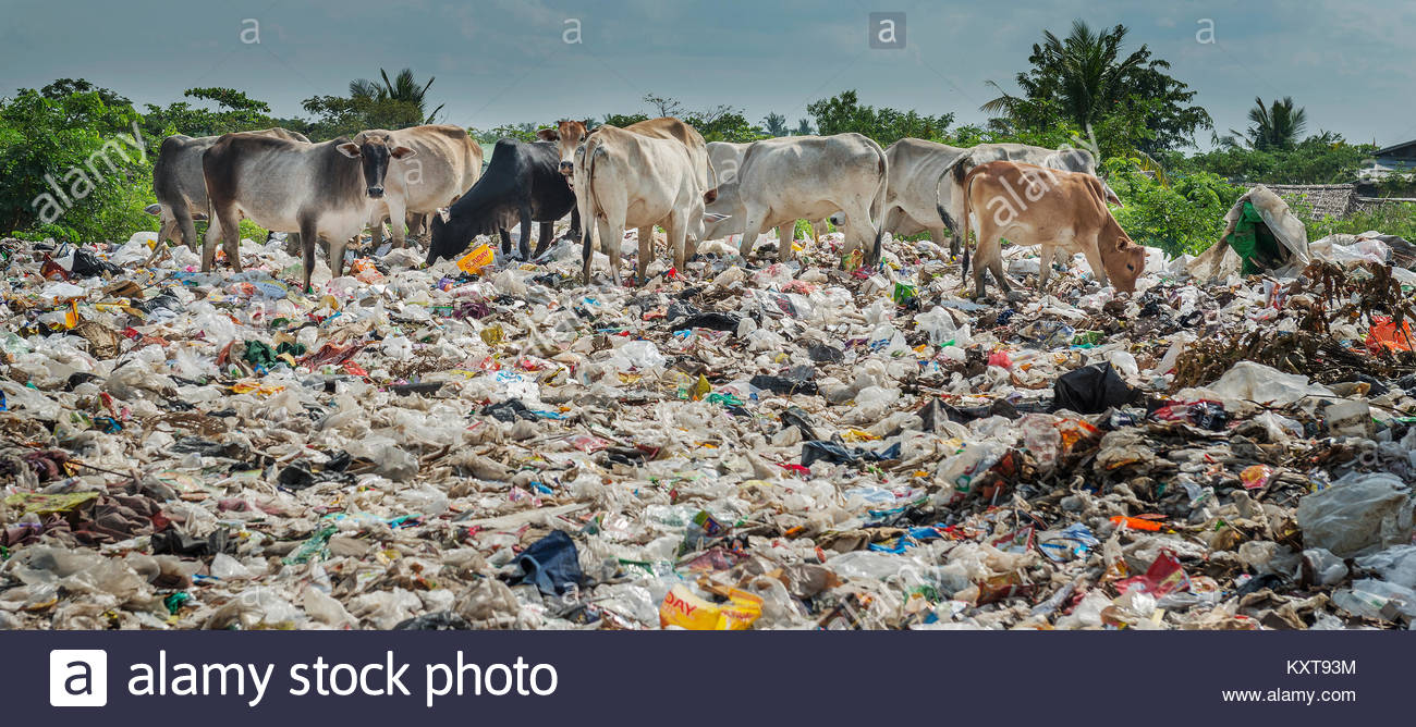 cows eating plastic waste dumped in a open field in Yangon, Myanmar