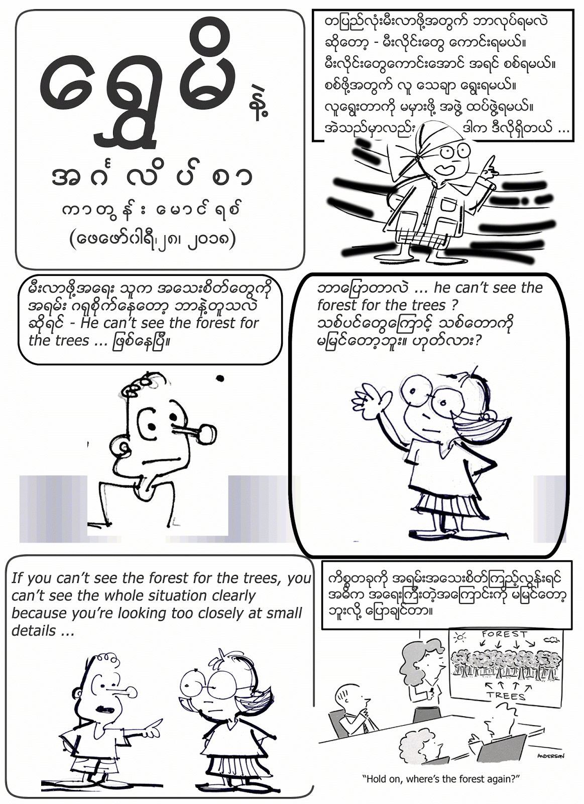 ကာတြန္း ေမာင္ရစ္ – ေရႊမိနဲ႔ အဂၤလိပ္စာ – can’t see the forest for the trees