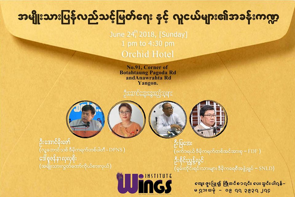 The Wines Institute က ႀကီးမွဴးက်င္းပတဲ့ အမ်ိဳးသားျပန္လည္သင့္ျမတ္ေရးႏွင့္ လူငယ္မ်ားရဲ႕အခန္းက႑ ေခါင္းစဥ္ျဖင့္ ေဆြး ေႏြးပြဲတရပ္ကို ရန္ကုန္ၿမိဳ႕ ဗိုလ္တေထာင္ဘုရားလမ္းနဲ႔ အေနာ္ရထာလမ္းေထာင့္ရွိ Orchid Hotelမွာ ဇြန္လ ၂၄ရက္ ေန႔ လယ္ ၁ နာရီမွ ညေန ၄ နာရီခြဲထိ က်င္းပျပဳလုပ္သြားမယ္လို႔သိရပါတယ္။