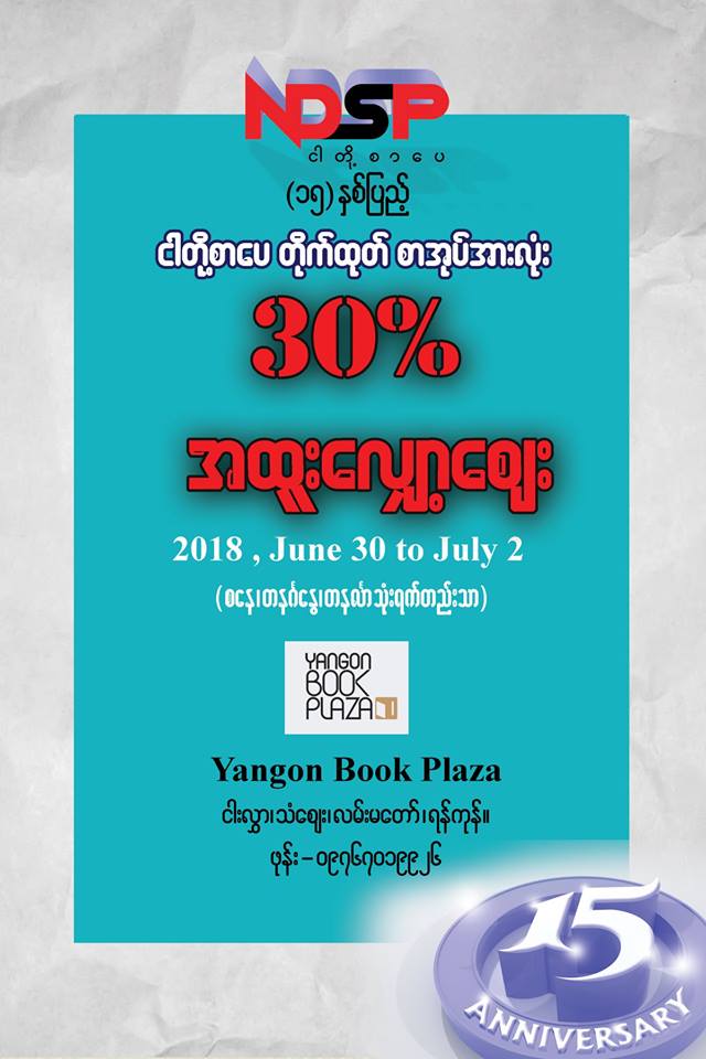 ငါတို႔စာေပ NDSP စာအုပ္တိုက္ ၁၅ ႏွစ္ျပည့္အထိမ္းအမွတ္ အခမ္းအနားကို ရန္ကုန္ၿမိဳ႕လမ္းမေတာ္ၿမိဳ႕နယ္ သံေစ်း ငါးလႊာရွိ Yangon Book Plaza မွာ ဇြန္လ ၃၀ရက္ကေန ဇူလိုင္ ၂ ရက္ထိ ျပဳလုပ္သြားမယ္လို႔သိရပါတယ္။
