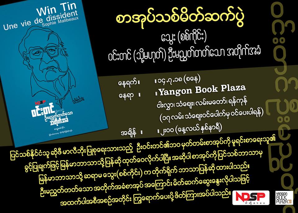 စာေရးဆရာမ ေသြး(စစ္ကိုင္း)ရဲ႕ဘာသာျပန္လက္ရာသစ္တခုျဖစ္တဲ့ ၀င္းတင္(သို႔မဟုတ္) ဦးမညႊတ္တတ္ေသာ အတုိက္ အခံ စာအုပ္မိတ္ဆက္ပြဲနဲ႔ေဆြးေႏြးပြဲကို ရန္ကုန္ၿမိဳ႕လမ္းမေတာ္ၿမိဳ႕နယ္သံေစ်း ငါးလႊာရွိ Yangon Book Plazaမွာ ဇူလိုင္ ၁၄ ရက္(စေနေန႔) ေန႔လယ္ ၂ နာရီမွာ ျပဳလုပ္က်င္းပသြားမယ္လို႔သိရပါတယ္။