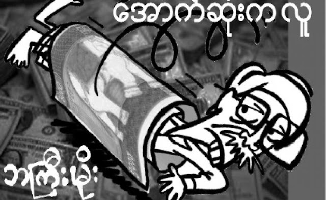 ဘႀကီးမိုးရတဲ့ စာမူခက က်ပ္ေငြ။ ေဒၚ လာေဈးက တစ္ေဒၚလာပဲ က်ပ္ ၁၄ဝဝ ရွိ ေနေလေတာ့ ေဆးဖိုး ၁၀ ေဒၚလာက်မယ္ ဆိုရင္ ျမန္မာက်ပ္ေငြနဲ႔ က်ပ္ ၁၄,ဝဝဝ ျဖစ္ ေနေတာ့ အဲသည္လိုေဆးမ်ိဳး ေလးငါးမ်ိဳး သာ မွာရမယ္ဆိုရင္ ျမန္မာက်ပ္ေငြနဲ႔ သိန္း ဂဏန္းေလာက္ ေရာက္သြားႏိုုင္တယ္ေလ။ ခက္တာက ဝင္ေငြက သိန္းဂဏန္းမွ မရွိ ဘဲကို။